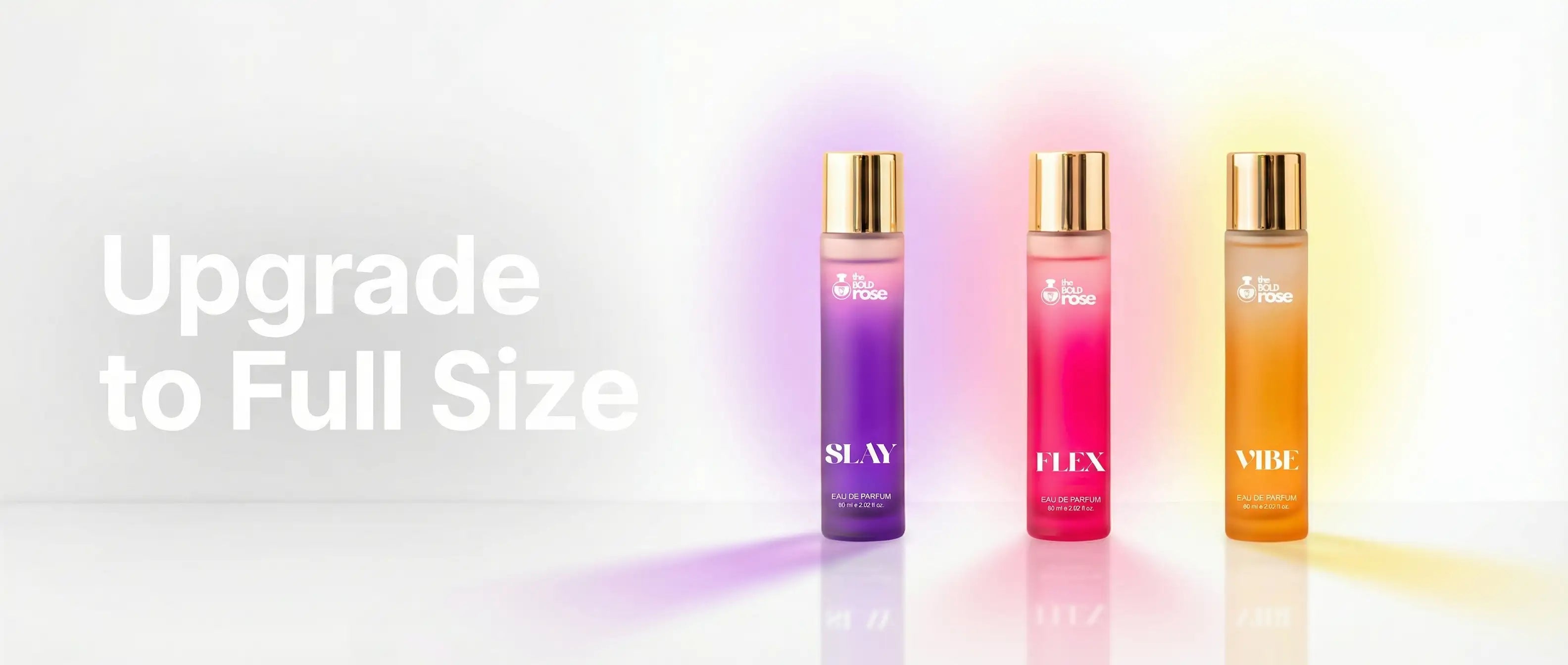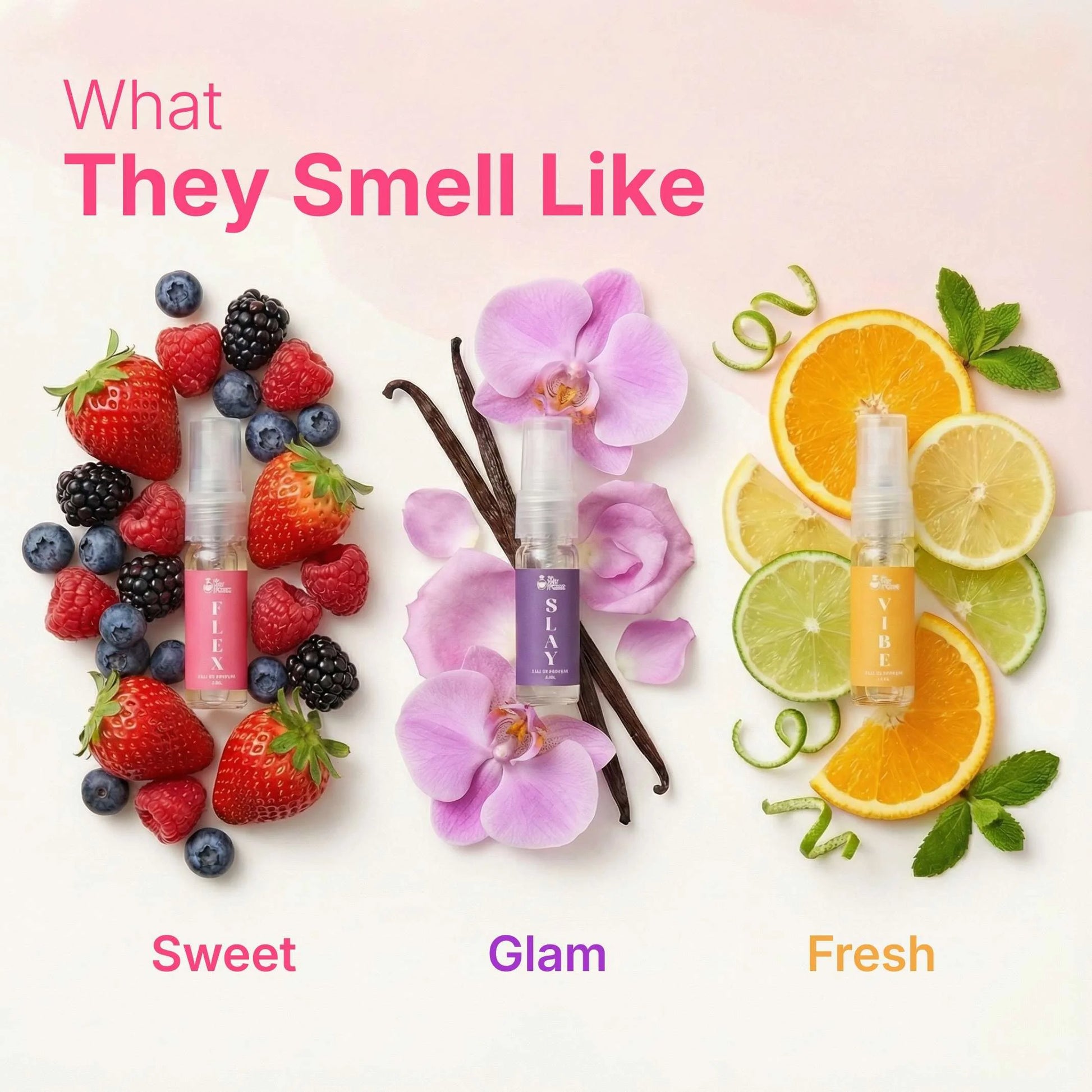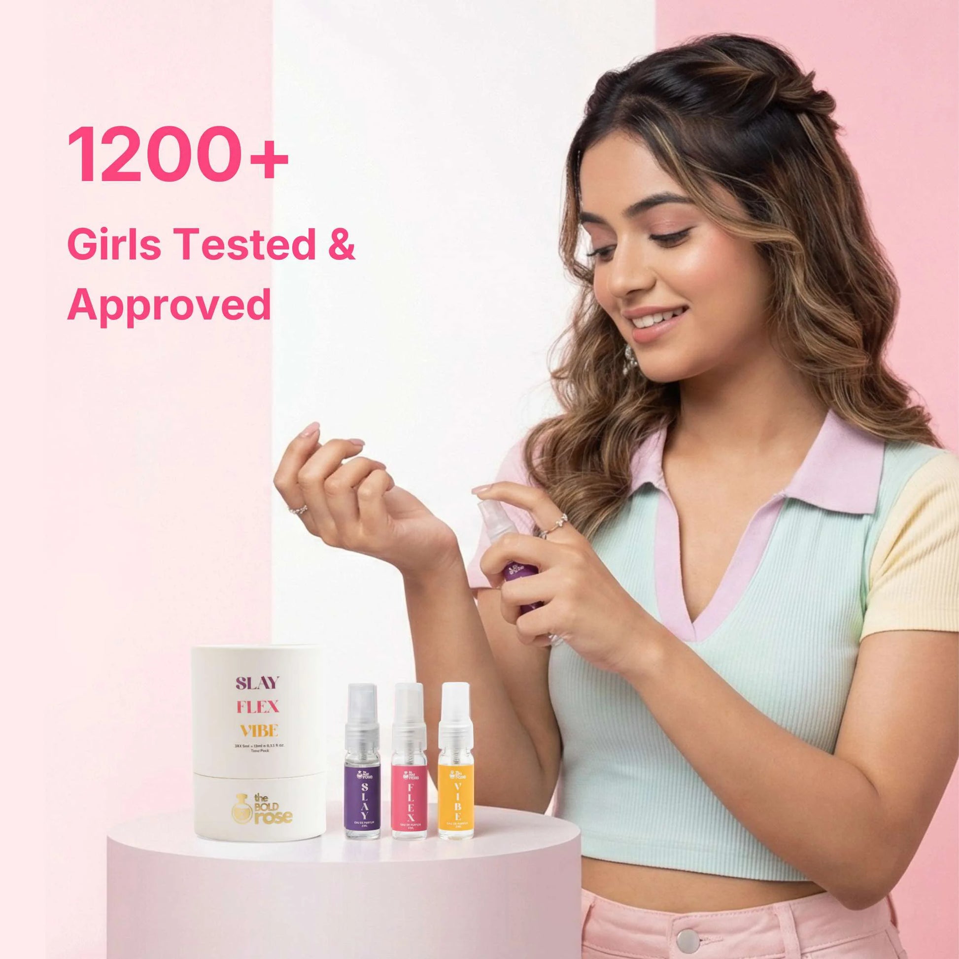 Bold Rose Trial Pack – 3 mini perfumes (5ml each) made specially for college girls to test and explore. Try Flex, Vibe & Slay in this pocket-sized set, and once you find your favorite, you can get the full-size 60ml bottle. Affordable, travel-friendly, and perfect to discover your vibe before going big.