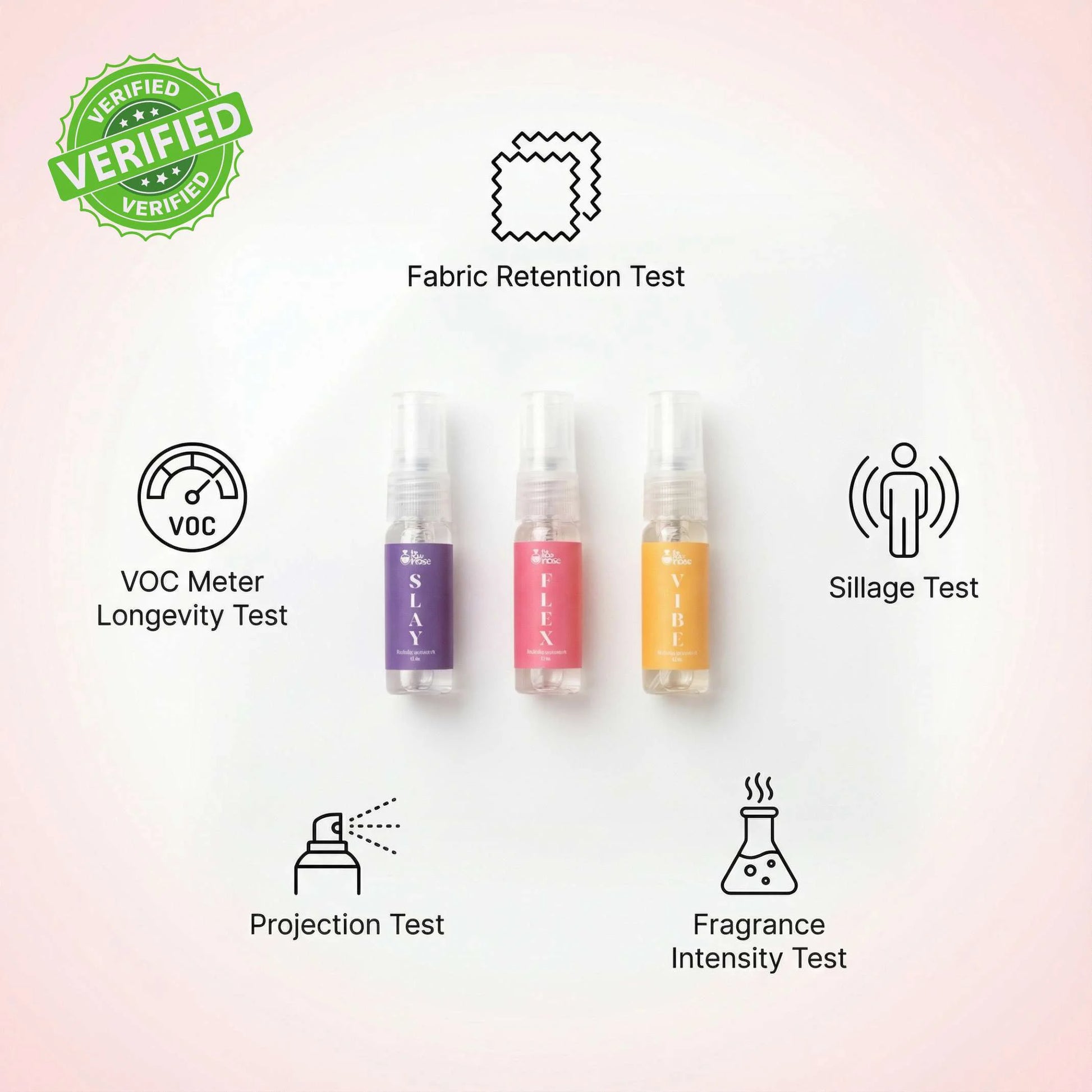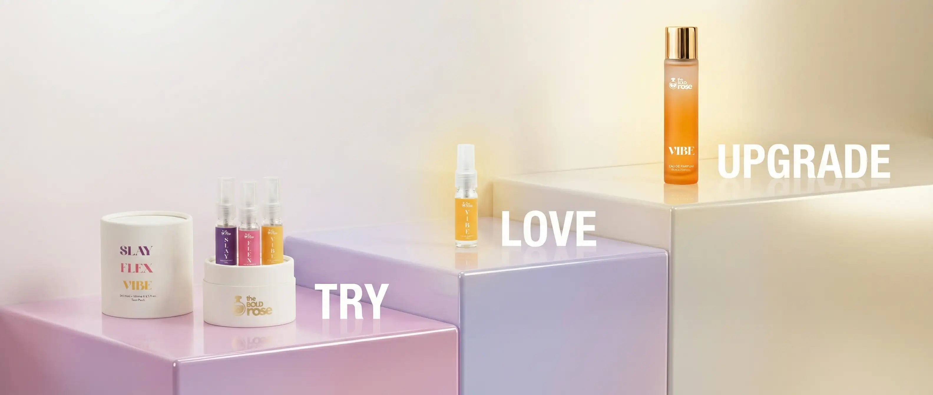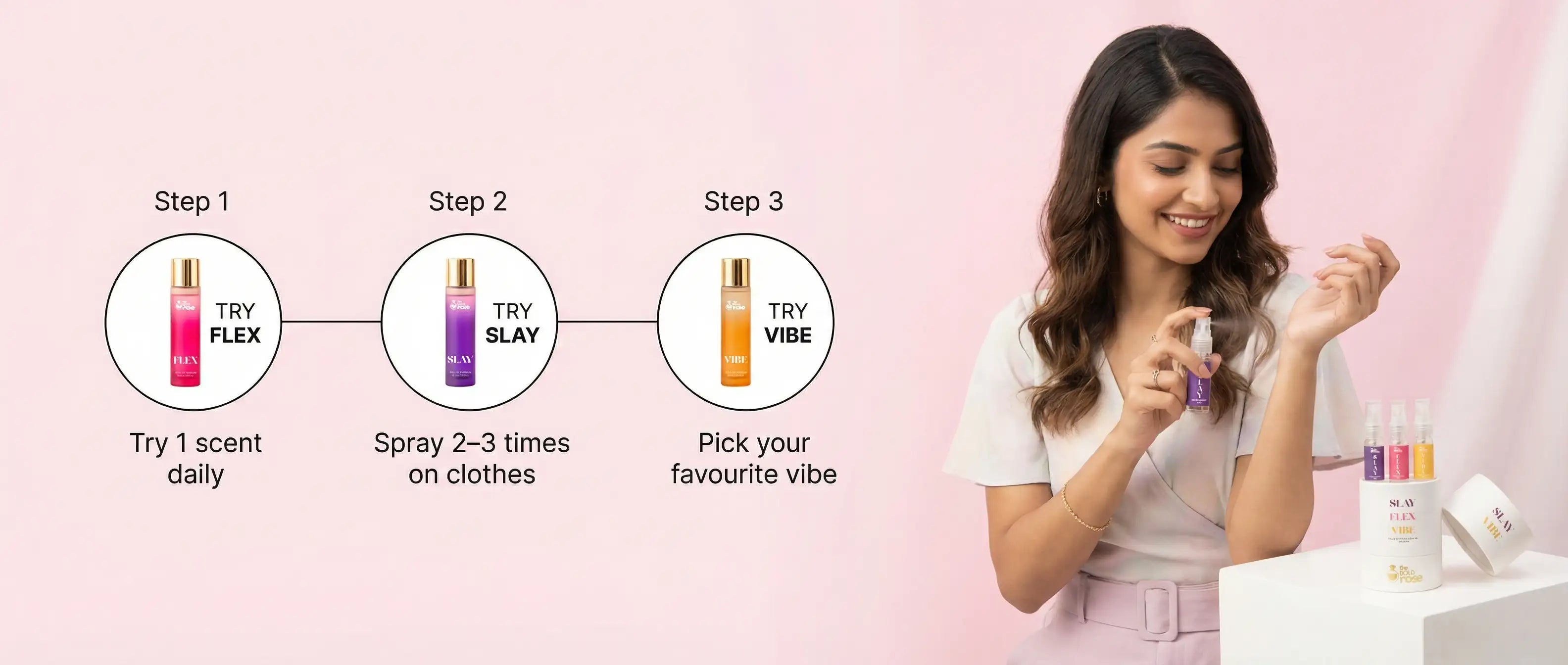 Bold Rose Trial Pack – 3 mini perfumes (5ml each) made specially for college girls to test and explore. Try Flex, Vibe & Slay in this pocket-sized set, and once you find your favorite, you can get the full-size 60ml bottle. Affordable, travel-friendly, and perfect to discover your vibe before going big.